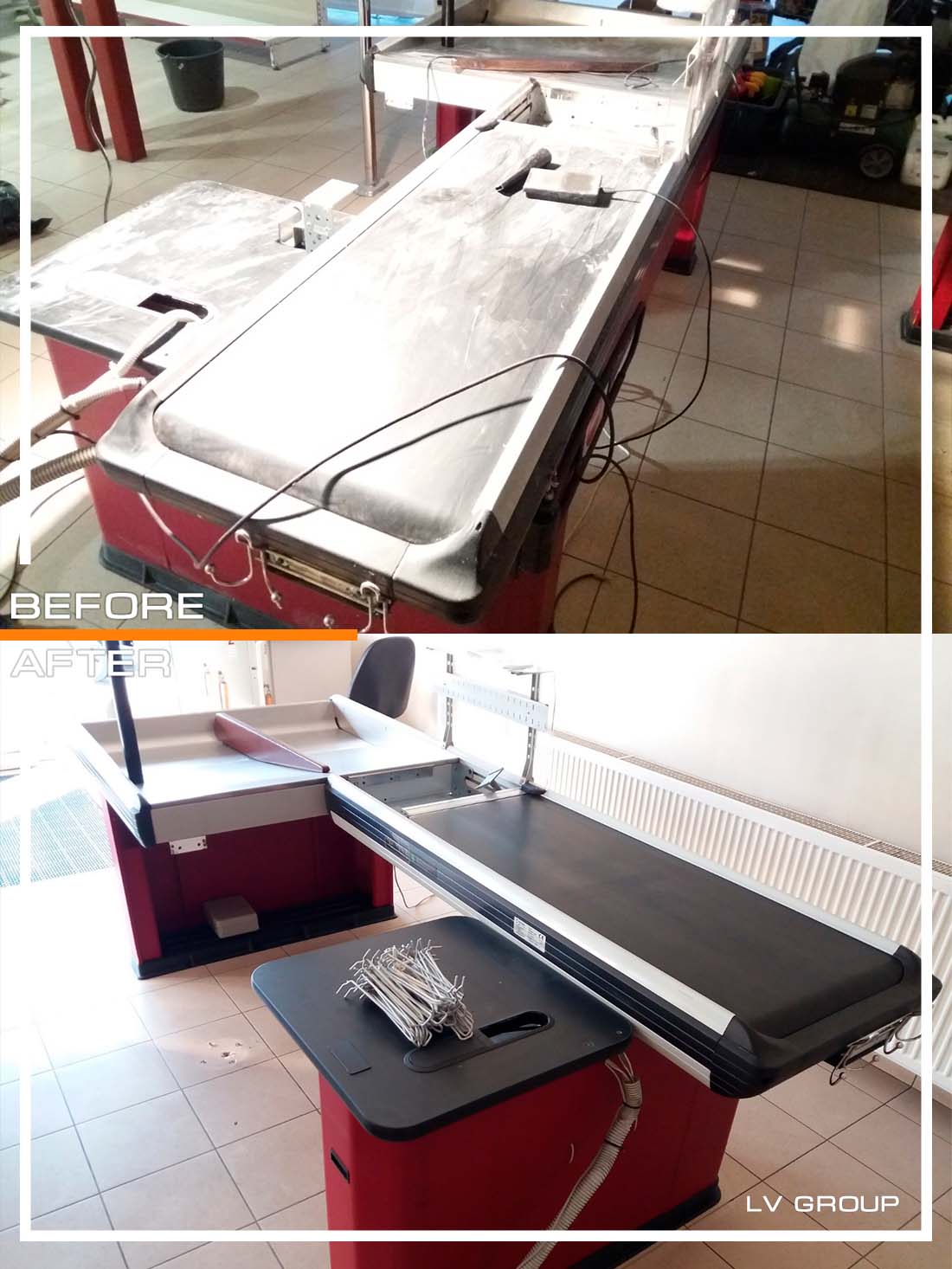 - Atkurti šaldytuvai, kasos aparatai, vitrinos, įrenginiai skirti pardavimams.